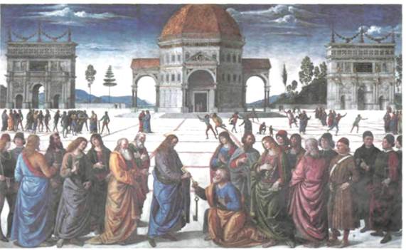 224. Пьетро Перуджино. Передача ключей Св. Петру. 1482 г. Фреска. Сикстинская капелла, Ватикан, Рим Рим Перуджино. Рим, в котором долгое время не проявлялось никакого интереса к искусству, пока папская резиденция вынужденно находилась в Авиньоне (см. стр. 184), снова превратился в круп ный центр меценатства. В конце XV века, когда папство опять обрело политическую власть на итальянской почве, преемники Св. Петра принялись украшать Ватикан и Рим, будучи уверенными, что памятники христианского Рима должны затмить сооружения языческого прошлого. Самым выдающимся произведением того времени стали росписи стен Сикстинской капеллы, выполненные около 1482 года. Среди художников, работавших над этим большим циклом сцен из Ветхого и Нового завета, были наиболее выдающиеся мастера Средней Италии, включая Боттичелли и Гирлан-дайо, хотя эти фрески не являются их лучшими достижениями. Однако, есть исключение: фреска «Передача ключей Св. Петру» (илл. 224), исполненная Пьетро Перуджино (ок. 1450—1523), считается его лучшим произведением. Художник родился близ города Пе руджа в Умбрии (к юго-востоку от Тосканы) и был тесно связан с Флоренцией. В начале творческого пути он испытал сильное влияние Верроккьо, о чем можно судить по скульптурной уравновешенности и основательности фигур в его фреске. Строгая симметрия композиции придает сюжету особую значительность: авторитет Св. Петра < как первого папы, а также всех его преемников, основывается на вручении ему самим Иисусом Христом ключей от царства небесного. Среди присутствующих при этом торжественном событии людей художник изобразил нескольких своих современников, ярко ин дивидуализировав их лица. Поражает пространст венная глубина росписи, где на заднем плане изо бражены две римские триумфальные арки, обрам ляющие увенчанное куполом здание, в котором можно узнать идеальный храм, описанный Альбер ти в трактате «О зодчестве». В пространственной ясности, достигнутой математически точным пос троением перспективы, чувствуется влияние Пьеро делла Франчески, который выполнил много работ для умбрийских заказчиков, особенно для герцога Урбинского. Тот же город Урбино около 1500 года дал Перуджино ученика, который вскоре затмил своего учителя. Имя его — Рафаэль, и ему было суждено стать непревзойденным классиком искус ства Высокого Возрождения. Высокое возрождение в Италии Принято считать, что вслед за Ранним Возро ждением естественно и неизбежно следует Высокое Возрождение, подобно тому, как на смену утру непременно приходит полдень. Великие мастера XVI века — Леонардо, Браманте, Микеланджело, Рафаэль, Джорджоне и Тициан — не только раз деляли идеалы своих предшественников, но и су мели настолько полно воплотить их в своем ис кусстве, что их имена стали синонимами совер шенства. В Творчестве этих художников искусство Ренессанса достигло наивысшего расцвета, вступило в свою классическую стадию — точно так же, как эпоха Перикла стала кульминацией древне греческого искусства. Кстати, можно объяснить, почему две эти классические стадии развития искусства были столь непродолжительными: если предположить, что искусство развивается по бал листической кривой, то тогда точка его наивысшего подъема не может длиться больше мгновения. В 1920-х годах историки искусства начали осознавать ограниченность этой схемы. Есл