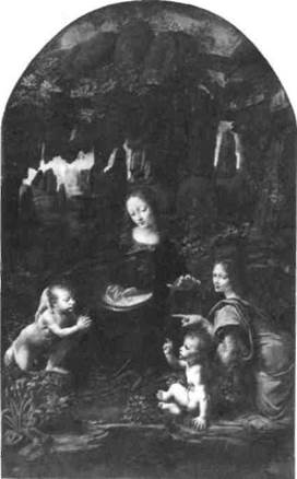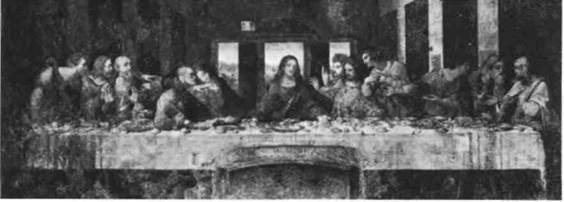 225. Леонардо да Винчи. Мадонна в скалах. Ок. 1485 г. Дерево, масло. 190,5 х 110,5 см. Лувр, Париж денца Иоанна младенцу Христу в присутствии Бо гоматери и ангела, очень необычен и трактован Леонардо в духе таинственности. Уединенный грот, заводь, тщательно подобранные и изысканно на писанные растения — все имеет символическое значение, трудно поддающееся объяснению. На каком смысловом уровне или уровнях должны мы толковать взаимоотношения четырех персонажей? Возможно, ключ к разгадке таится в их жестах. Защищающий, указывающий и благословляю щий — они убедительно передают чудо признания Св. Иоанном в Христе Спасителя. «Тайная вечеря». Несмотря на необычность трактовки сюжета, картина «Мадонна в скалах» все еще связана по своему замыслу с искусством Раннего Возрождения. Написанная же почти спустя десятилетие «Тайная вечеря» Леонардо (илл. 226) ВЫСОКОЕ ВОЗРОЖДЕНИЕ В ИТАЛИИ • 243