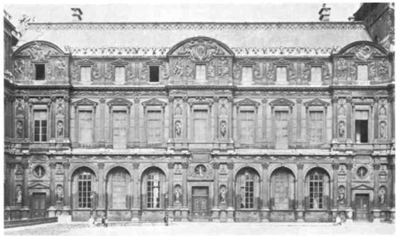 восходят безбрежные дали в пейзажах зрелого Брейгеля. «Возвращение охотников» (илл. 267) — одна из серии картин, посвященных отдельным месяцам. Начало подобным сериям, напомним, пол ожили иллюстрированные средневековые календа ри, и в сцене, изображенной Брейгелем, все еще чувствуется влияние миниатюр «Богатейшего ча сослова» герцога Беррийского (см. илл. 184). Здесь, однако, природа — уже не только обстановка для деятельности человека, но и главное содержание картины. Мужчины и женщины, погруженные в свои обычные сезонные заботы,— нечто случайное в величественном ежегодном круговороте умирания и возрождения, овеянном живым дыханием ритма космоса. ФРАНЦИЯ Для усвоения итальянских форм архитектором и скульпторам северных стран потребовалось боль ше времени, чем живописцам. Франции, теснее других стран связанной с Италией (вспомним, что в 1499 году Франция завоевала Милан), первой удалось добиться создания целостного ренессанс ного стиля. В 1546 году король Франциск I, который и раньше выражал свое восхищение итальянским искусством, пригласив во Францию сначала Лео нардо в 1517 году, а затем маньеристов (см. стр. 2б9), решил построить на месте старого го тического королевского замка, носившего название Лувр (см. илл. 184), новое и гораздо более обширное строение. Осуществление этого проекта, едва на чатое к моменту кончины Франциска I, было завершено лишь столетие спустя; но самая ранняя его часть, построенная Пьером Леско (ок. 1515— 1578),— это самый блестящий из дошедших до нас образцов архитектуры Северного Возрождения. Леско. Детали фасада, созданного Леско (илл. 268), поражают своей классической чистотой, но при этом трудно принять его по ошибке за творение итальянского зодчего. Его отличительная черта — не поверхностное восприятие итальянских форм, а подлинный синтез традиционного французского chateau (замка) и ренессансного дворца. Конечно, накладные классические ордеры, оконные обрамления с портиками и аркады первого этажа заимствованы у итальянцев. Но непрерывность линии фасада нарушается тремя выступающими вперед павильонами-ризалитами, которые увенчаны башенками, характерными для французских замков; традиционно французский характер придан и крыше с крутыми скатами. Тем самым обеспечивается преобладание вертикальных ритмических акцентов над горизонтальными, и этот эффект еще больше усилен высокими, узкими окнами. Пилон. Величайшим скульптором конца XVI столетия был Жермен Пилон (ок. 1535—1590). В начале своего творческого пути он многому СЕВЕРНОЕ ВОЗРОЖДЕНИЕ — 285