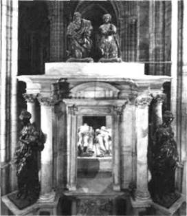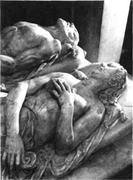 269— Франческо Приматиччо и Жермен Пилон. Гробница Генриха II и Екатерины Медичи. 1563—1570 г. Аббатская церковь Сен-Дени в Париже 270. Жермен Пилон. Лежащие фигуры (gisants) короля и королевы — деталь гробницы Генриха II и Екатерины Медичи. Мрамор научился у Франческо Приматиччо, соперника Чел лини при дворе Франциска I (см. стр. 268), но вскоре выработал собственный стиль, в котором маньеризм Фонтенбло органично слился с элементами, заимствованными из античной скульптуры, у Микеланджело и из готической художественной традиции. Талант Пилона проявился главным об разом в монументальных надгробиях, самым ран ним и значительным из которых является надгробие Генриха II и Катерины Медичи (илл. 269). Архитектурное обрамление памятника — продол говатая, отдельно стоящая часовня на украшенном рельефами из бронзы и мрамора возвышении принадлежит Приматиччо. На углах возле памят ника установлены четыре большие бронзовые ста туи Добродетелей, выполненные в стиле Фонтенбло; на гробнице — коленопреклоненные фигуры мо лящихся короля и королевы; внутри часовни мо наршая чета изображена в виде мраморных gisanti, или обнаженных, распростертых фигур усопших (илл. 270). Такой контрастный способ изображения фигур был характерен для готических надгробий XIV века: gisanti символизировал тленную природу плоти, и тело обычно изображалось уже на стадии раз ложения, иногда с ползающими через отверстия паразитами. Как можно было придать такому мрач ному образу ренессансную форму, не утрачивая его эмоционального значения? Пилон нашел блестящее решение: идеализирую gisanti, он меняет их смысл на противоположный. Королева, лежащая в позе классической Венеры, и король в позе мертвого Христа не только не вызывают чувства ужаса или скорби, а, наоборот, исполнены пафоса красоты, одолевающей даже смерть. Вместо шокирующего впечатления, которое производили в былые времена подобные фигуры, здесь, благодаря выразительности памятника, достигается иная, хотя и ничуть не меньшая, острота переживания. Вспоминая проведенное нами выше различие между классическим и средневековым отношением к смерти (см. стр. 223), мы можем выразить это чувство следующим образом. Готический gisanti — образ, в котором подчеркнуто физическое разло жение плоти, представляет будущее состояние тела в соответствии со всем «перспективным» характе ром средневековой гробницы. Gisanti Пилона — «ретроспективны», хотя в них и не отрицается реальность смерти. Именно в таком единстве про тивоположностей (которого ни разу не удалось повторить, даже самому Пилону) и кроется причина величия этих фигур. БАРОККО В ИТАЛИИ И ИСПАНИИ Что такое «барокко»? Как и «маньеризм», сам термин первоначально был создан с целью дис кредитации определяемого им стиля — он означал «неправильный, искаженный, гротескный». Истори ки искусства все же делятся по поводу этого определения на две категории. Должно ли понятие «барокко» использоваться только для обозначения преобладающего стиля XVII столетия или же в него надо включать и другие художественные тенденции эпохи — такие, например, как классицизм, взаимоотношения с которым у него складывались весьма сложно? Не следует ли раздвинуть времен ные рамки, относя к периоду барокко и первую половину XVIII века вместе со стилем, получившим название «рококо»? Еще важнее такой вопрос: составляет ли барокко 