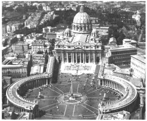 277. Собор Св. Петра в Риме (аэрофотосъемка). Неф и фасад — архитектор Карло Мадерна, 1607—1615 г.; колоннада — архитектор Джанлоренцо Бернини, по проекту 1657 г. живописное единство такого потрясающего вели чия, что все различия между ними отпадали сами собой. Несмотря на оживленность споров, на прак тике обе стороны редко вступали в конфликт по поводу масляной живописи, где различия между Кортоной и классицизмом последователей Карраччи не всегда были так ясно выражены. Однако дви жение против того, что считалось излишествами зрелого барокко, возглавил вовсе не живописец автор фресок, и даже не итальянец, а французский художник, живший в Риме — Никола Пуссен (см. стр. 317-319). Архитектура и скульптура в Италии Собор Св. Петра. В архитектуре подметить первые признаки формирования барочной стили стики с той же степенью точности, как в живописи, невозможно. В обширной церковной программе строительства, осуществлявшейся в Риме в конце XVI века, наиболее талантливым из молодых ар хитекторов проявил себя Карло Мадерно (1556— 1629). В 1603 году ему было поручено завершить, наконец, церковь Св. Петра. Папа решил пристро ить к спроектированному Микеланджело зданию (см. илл. 236) неф, преобразуя его в базилику. Изменение плана (которое могло быть подсказано примером церкви Иль Джезу), позволило соединить собор Св. Петра с Ватиканским дворцом (справа от церкви на илл. 277). Проект фасада, выполненный Мадерно,^ про должает разработку плана, намеченного Микелан джело для внешнего вида храма. Он состоит из колоссального ордера, несущего аттик, но с под черкнуто резким выделением порталов. Эффект, нарастающий от углов здания к центру, можно передать с помощью\ музыкального термина «крес чендо». Расстояние/ между опорными столбами уменьшается, пилястры превращаются в колонны, а стена фасада шаг за шагом выступает вперед. Идея этого нарастания ритма была подсказана фасадом храма Иль Джезу, созданным на поколение раньше Джакомо делла Портой (см. илл. 256). Мадерно сделал этот принцип главенствующим в своих проектах фасадов — не только собора Св. Петра, но и меньших по размерам храмов. При 296 • БАРОККО В ИТАЛИИ И ИСПАНИИ этом зодчий отошел и от традиционного решения церковного фасада в виде нерасчлененной стенной поверхности, оставшегося еще без изменений в фасаде церкви Иль Джезу,— он заменил его «уг лубленным фасадом», динамично соотносящимся с окружающим пространством. Богатые возможности, содержавшиеся в этом новом решении, истощились лишь полтора столетия спустя.