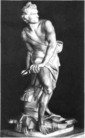 Бернини. Работа Мадерно ш, перестройке со бора Св. Петра была завершена Джанлоренцо Бер нини (1598—1680) — величайшим скульптором и архитектором столетия. Именно Бернини принад лежит заслуга организации открытого пространства перед фасадом собора в виде великолепного оваль ного «двора», обрамленного колоннадами, которые сам архитектор сравнил с материнскими объятиями Церкви. По силе впечатления с этим грандиозным ансамблем, связавшим здание с огромным «сформованным» открытым пространством площа ди, может сравниться разве что древнеримское святилище в Палестрине (см. илл. 84). Это не единственный пример переклички ба рочного искусства с античностью. Прослеживается сходство и между эллинистической и барочной скульптурой. Если мы сравним «Давида» (илл. 278) работы Бернини со скульптурой Микеланджело и зададимся вопросом, какая из них ближе к Пер гамскому фризу (см. илл. 231, 77), то нам придется признать первенство Бернини. С эллинистическими произведениями его скульптуру сближает как раз то единство плоти и духа, движения и эмоции, которого так целенаправленно избегал Микеланд жело. Однако отсюда вовсе не вытекает, что Бер нини более классичен, нежели Микеланджело — этот пример показывает прежде всего, что и ба рокко, и Высокое Возрождение признавали авто ритет античного искусства, но каждый период черпал вдохновение из различных его сторон. Совершенно очевидно, что «Давид» Бернини — ни в коей мере не подражание Пергамскому алтарю. Барочным его делает подразумеваемое присутствие Голиафа. В отличие от других статуй, изображающих Давида, включая и работу Дона телло (см. илл. 203), скульптура Бернини задумана не как самостоятельная фигура, а как часть парной группы — все внимание изображенного сосре доточено на его противнике. Интересно, намере вался ли Бернини создать статую Голиафа для придания группе завершенности? Он этого не сде лал, но по его «Давиду» мы можем ясно понять, где он видит своего противника. Соответственно, пространство между Давидом и его невидимым соперником заряжено энергией — оно «принадле жит» статуе. «Давид» Бернини показывает нам, в чем со стоит отличие барочной скульптуры от скульптуры двух предыдущих столетий: ее новые, активные пластические отношения с окружающим простран ством. Она отказывает от самодостаточности ради иллюзии живого присутствия или подразумеваемых поведением статуи сил. Поскольку в барочной скульптуре так часто встречается «невидимое до полнение» (подобно Голиафу в «Давиде» Бернини), она является своего t рода «фокусом», так как пытается использовать те художественные эффекты, которые традиционно не относились к ее сфере. Такое наполнение пространства активной энергией является, по существу, определяющим признаком всего барочного искусства. Караваджо добился этого в «Св. Матфее» с помощью резко сфокуси рованного луча света. Действительно, искусство барокко не признает принципиальных различий между скульптурой и живописью. Они могут даже БАРОККО В ИТАЛИИ И ИСПАНИИ — 297