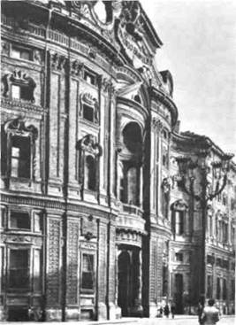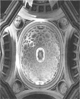 нигде в мире. Это подтверждают иностранцы, ко торые... пытаются заполучить копии плана. У нас их просили немцы, фламандцы, французы, италь янцы, испанцы и даже индийцы...» Гварини. Богатству новых идей, предложенных Борромини, было суждено найти себе применение не в Риме, а в Турине, столице Савойи, которая стала центром итальянской барочной архитектуры конца XVII века. В 1666 году в этот город был приглашен самый блестящий из последователей Борромини — монах Гварино Гварини (1б24—1683), чей архитектурный гений был основательно под креплен философскими и математическими зна ниями. Его проект фасада палаццо Кариньяно (илл. 283) повторяет в большем масштабе волнообразные ритмы церкви Сан-Карло алле Кваттро Фонтане, но с применением сугубо индивидуальных худо жественных средств. Как это ни кажется неверо ятным, в наружной отделке всего здания, вплоть до мельчайших декоративных деталей, использован только кирпич. 282. Купольный свод церкви Сан Карло алле Кваттро Фонтане