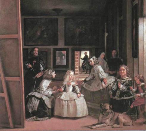 284. Франсиско де Сурбаран. Св. Серапион. 1628 г. Холст, масло. 120,7 х 104,1 см. Уодсворт Атенеум, Хартфорд (Коннектикут). Собр. Эллы Гэллап Сэмнер и Мэри Кетлин Сэмне конце 1б20-х годов, став придворным художником, Веласкес поселился в Мадриде, где в основном писал портреты членов королевской семьи. Во время одного из посещений испанского двора фла мандский художник Питер Пауль Рубенс помог ему постичь красоту Тициана, большое собрание работ которого имелось в королевской коллекции, и бла годаря искусству итальянского мастера Веласкесу удалось добиться небывалой плавности и насы щенности живописи. В картине «Менины» (илл. 285) во всем блеске проявился зрелый стиль художника. Это одновре менно и групповой портрет, и жанровая сцена. Картину можно было бы назвать и «Художник в своей мастерской», так как Веласкес изобразил себя самого за работой над огромным полотном. В центре — только что позировавшая ему маленькая принцесса Маргарита, среди подружек по играм и служанок. Лица ее родителей, короля и королевы, видны в зеркале на задней стене. То ли они только что вошли в комнату и перед ними предстала точно та же сцена, что и перед нами, то ли в зеркале видно отражение части холста (предположительно, портрета королевской семьи в полный рост), над которым работает художник. Эта двойственность говорит об увлечении Веласкеса световыми эффектами. Художник как бы предлагает нам самим отыскать на картине нюансы прямого и отраженного света. Предполагается, что мы сумеем соотнести зеркальный образ с карти БАРОККО В ИТАЛИИ И ИСПАНИИ • 301