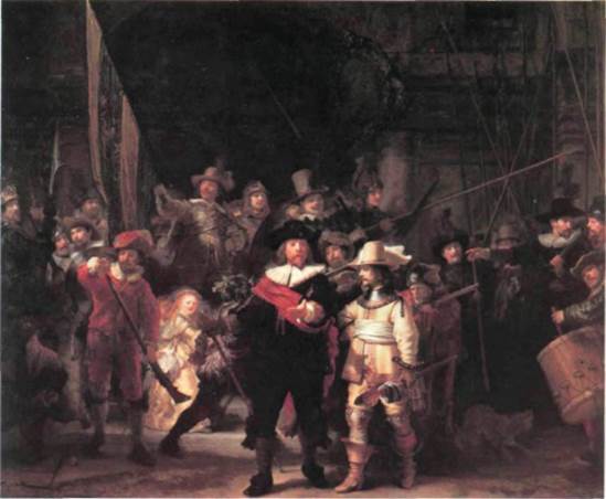 295. Рембрандт. Ночной дозор (Рота капитана Франса Боннинга Кока). 1642 г. Холст, масло. 3,71 х 4,45 м. Рейксмюсеум, Амстердам щий духу этого изысканного занятия. Для передачи духовной атмосферы сцены Лейстер использовала поэтическое свойство, присущее ровному, интен сивному свету, и в этом она является предтечей Вермера, который появится через поколение (см. илл. 301). Рембрандт. Как и на Хальса, на Рембрандта (1б0б—1669) — величайшего гения голландского искусства — стимулирующее воздействие в начале его творческого пути оказали косвенные контакты с Караваджо. Для ранних картин Рембрандта ха рактерны небольшие размеры, резкое освещение и напряженный реализм. Многие из них посвящены ветхозаветной тематике, которой он отдавал пред почтение на протяжении всей своей жизни. По сравнению со стилистикой итальянского мастера, они более реалистичны и в них присутствует новое эмоциональное отношение. Рембрандт трактовал ветхозаветные сюжеты в том же светском хрис тианском духе, какой отличал подход Караваджо к Новому Завету: он рассматривал их как прямые свидетельства общения Бога с Его человеческими творениями. Насколько сильно было влияние этих библейских эпизодов на художника, видно по кар тине «Ослепление Самсона» (илл. 294). На холсте, написанном Рембрандтом в характерном для него, раскрывшемся в 1бЗО-х годах во всю мощь, стиле зрелого барокко, изображен ветхозаветный мир со всем его восточным великолепием и насилием. Поток яркого света, льющегося в темную палатку, имеет неприкрыто театральный характер и усили вает драматизм сцены до такого напряжения, ко торое делает ее сопоставимой с «Воздвижением креста» (см. илл. 286) Рубенса — художника, с творчеством которого Рембрандт соперничал. Рембрандт был тогда страстным коллекционе ром ближневосточных бытовых предметов, которые 310 • БАРОККО ВО ФЛАНДРИИ И ГОЛЛАНДИИ