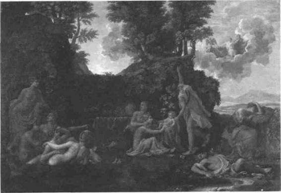 304. Никола Пуссен. Рождение Вакха. Ок. 1657 г. Холст, масло. 123 х 179 см. Художественный музей Фогга, Художественные музеи Гарвардского университета, Кембридж (Массачусетс). Дар г-жи Сэмуэль Сакс в память об ее муже, г-не Сэмуэле Саксе теллектуального стиля Пуссена. Тщательно пропи санные фигуры словно «заморожены в действии» подобно статуям, да многие из них, по существу, и заимствованы из эллинистической скульптуры. Пуссен разместил их перед археологически точны ми, как он считал, реконструкциями римской ар хитектуры. В композиции присутствует налет те атральности, и не без причины — она была создана путем перемещения глиняных фигурок по мини атюрному подобию сцены, до тех пор, пока их расположение не показалось художнику верным. Чувства демонстрируются на картине в избытке, но им явно недостает спонтанности, и они не вызывают у нас никаких переживаний. Очевидно, что используемые здесь художественные принципы восходят к Рафаэлю. Или же, точнее, это Рафаэль, пропущенный через Аннибале Карраччи и его школу (сравн. илл. 273, 274). Венецианские черты, которые проявились уже в начале творческого пути художника, были им сознательно подавлены. Пуссен может поразить нас как человек, которому был полностью подвластен его собственный разум,— такое впечатление подтверждается мно гочисленными письменами, в которых он излагает свои взгляды друзьям и меценатам. Высочайшей целью живописи, полагал он, является изображение возвышенных и серьезных человеческих поступков. Их следует изображать логично и упорядоченно; то есть не так, как все происходило на самом деле, а так, как случилось бы, если бы природа была совершенной. С этой целью художник должен стремиться к общему и типическому. Апеллируя больше к уму, нежели к чувствам, ему следует меньше заниматься такими незначительными ве щами, как цвет, а главное внимание уделять форме и композиции. На хорошей картине зритель всегда сможет «прочитать» точные чувства каждой фигуры и соотнести их с сюжетом. Эти идеи не были новы. Нам вспоминается античное выражение «ut pictura poesis» («живопись — это та же поэзия») и утверждение Леонардо, что высшей целью жи вописи является изображение «намерений челове ческой души» (см. стр. 244, 291). До Пуссена, однако, никто не проводил такой тесной аналогии между живописью и литературой, и не воплощал эту теорию с такой буквальностью на практике. Именно методом художника объясняется ощущае мое нами присутствие холодной, назойливой рито БАРОККО ВО ФРАНЦИИ: ЭПОХА ВЕРСАЛЯ • 319 рики в «Похищении сабинянок», из-за которой картина кажется нам столь чуждой, хотя мы не можем не восхититься ее строгой упорядочен ностью. В соответствии с этими теоретическими взгля дами писал Пуссен и «идеальные пейзажи», причем добиваясь весьма впечатляющих результатов, так как эти пейзажи были отмечены сдержанной кра сотой и осмысленным покоем. В таком строго рационалистическом духе Пуссен работал примерно до середины XVII века, когда он начал писать серию пейзажей, которая знаменовала его возврат к мифологической тематике, оставленной им в среднем возрасте. Тициановская манера его раннего творчества сочетается в них с поздним, рафаэлев ским классицизмом, давая в итоге новый вид мифологического пейзажа, близкого по духу к Клоду Лоррену (см. ниже), но богатой личными ассоциациями, которые придают образа