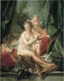 312. Жан-Антуан Ватто. Паломничество на остров Киферу. 1717 г. Холст, масло. 1,3 х 1,94 м. Лувр, Париж пущен в Академию за его «Паломничество на остров Киферу» (илл. 312). Эта картина нарушала все правила академизма, а ее тема не подходила ни под одну из установленных категорий. Для приема Ватто в академию была создана новая категория — «fetes galantes» («галантных праздников»). Этот термин в меньшей степени относится к данной картине, чем к творчеству художника в целом, в котором в основном представлены сцены избранного общества или комедианты в похожей на парк обстановке. Ватто своеобразно соединяет театр и реальную жизнь, так что провести четкую грань между ними невозможно. «Паломничество на остров Киферу» включает в себя еще один элемент: классическую мифологию. Юные пары приехали на Киферу, остров любви, отдать долг богине Венере, образ которой в обрамлении гирлянд виднеется вдали справа. Они вот-вот сядут на корабль, в окружении сонма амуров. Эта сцена сразу напоминает «Сад любви» Ру бенса (см. илл. 288), но Ватто привнес в нее какую то особую остроту, придал ей поэтическое изящество, напоминающее Джорджоне (см. илл. 239). Помимо того, в его фигурах отсутствует та жиз ненная сила, которой наделены персонажи Рубенса. Стройные и изящные, они передвигаются с отре петированной уверенностью актеров, настолько превосходно исполняющих свои роли, что их игра волнует нас даже больше, чем могла бы волновать сама реальность. В них обрел новую жизнь былой идеал «манерного» изящества. Буше. Творчество Буше является свидетельст вом общего сдвига во французском искусстве в сторону рококо. Сам этот термин первоначально применялся для характеристики прикладного ис кусства (см. стр. 332), но он вполне соответствует игривому характеру и французской живописи до 1765 года. Около 1720 года даже историческая живопись приобрела камерность и восхитительную стилистическую и тематическую выразительность. Самым ярким живописцем этого направления был Франсуа Буше (1703—1770), искусство которого зна менует эпоху мадам де Помпадур, фаворитки Лю довика XV. Написанная Буше для ее частной ре зиденции картина «Туалет Венеры» (илл. 313) полна шелка и духов. Если Ватто возводил человеческую РОКОКО • 327
