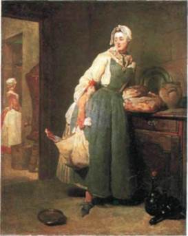 любовь до уровня мифологии, то Буше поднял игривый эротизм до мира божественного. Утрату эмоциональной глубины, отличающей искусство Ватто, Буше компенсирует непревзойденным про никновением в мир фантазии, так обогащающей человеческую жизнь. И все же по сравнению с богиней Вуэ (см. илл. 306), от которой она произошла, героиня Буше гораздо более кокетлива. В этом небывалом кос метическом царстве Венера, предстающая в своей юной красе, как бы теряет признаки возраста — у нее неизменно нежная, розовая кожа и те же прислуживающие ей херувимы. Однако богиня любви, изображенная в этой ловушке вечной юнос ти, кажется, как это ни странно, неспособной на страсть. Шарден. Художественную манеру Жана-Батиста Симеона Шардена (1699—1779) можно отнести к рококо только с оговорками. «Рубенсисты», помимо прочего, подготовили почву и для возрождения интереса к натюрморту и жанровой живописи гол ландских и фламандских мастеров. Этому способ ствовало то обстоятельство, что во Франции ра ботало множество художников из Нидерландов, осо бенно из Фландрии, которые все чаще селились в этой стране после 1550 года, сохраняя в то же время творческие связи с родиной. Шарден — лучший французский художник этого направления. Тем не менее он далеко отстоит от голландских и фламандских мастеров — если не по тематике, то по духу и по стилистике. Его живопись оказывает на зрителя нравственное воздействие, но, в отличие от типично барочных натюрмортов (см. стр. 312— 315), оно достигается не с помощью нравоучительной символики, а живописным раскрытием достоинств существующего уклада жизни и его ценностей. Представители нарождавшегося среднего класса, к которому принадлежали и меценаты, оказывавшие художнику материальную поддержку, находили в его жанровых сценах и кухонных натюрмортах утверждение близких им добродетелей упорного труда, экономности, честности и верности семье. На картине «Возвращение с рынка» (илл. 314) парижская домохозяйка среднего достатка изобра жена с таким восхищением неприметной красотой повседневного быта и с таким благостным чувством упорядоченности пространства, что напрашивается сравнение с работами Вермера, хотя очень свое образная манера письма Шардена заметно отличает его от любого из голландских художников. Он не склонен к броским эффектам. Его кисть передает воздействие света на цветные поверхности с ха 313. Франсуа Буше. Туалет Венеры. 1751 г. Холст, масло. 108,3 х 85,1 см. Музей Метрополитен, Нью-Йорк 314. Симеон Шарден. Возвращение с рынка. 1739 е. Холст, масло. 47 х 37,5 см. Лувр, Париж 328 • РОКОКО