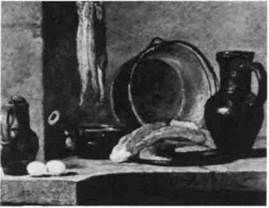 315. Симеон Шарден. Кухонный натюрморт. Ок. 1731 г. Холст, масло. 31,8 х 39,1 см. Музей Ашмола, Оксфорд. По завещанию г-жи В. Ф. Уэлдон рактерным кремоватым оттенком, при этом ана литический подход сочетается у французского жи вописца с изысканным лиризмом. Для раскрытия внутренней сути вещей Шарден прибегает к обоб щению форм, видоизменяя их внешний вид и фактуру, но не стремясь к тщательному прописы ванию деталей. Шарден умел найти скрытую по эзию даже в самых непритязательных предметах и наполнить их вневременным достоинством. Об становка на его натюрмортах выглядит, как правило, одинаково скромно — в отличие от своих голландских предшественников, он не стремится к «облагораживанию предмета». В его «Кухонном натюрморте» (илл. 315) мы видим только обычные вещи, какие можно встретить на любой кухне: глиняные горшки, кастрюлю, медный кувшин, кусок сырого мяса, копченую селедку, два яйца. Но какими важными они предстают на картине и как основательно, прочно расставлены они по отношению друг к другу. Каждый предмет пред ставляется художнику — и нам вместе с ним! — бесконечно ценным, заставляющим вновь и вновь его разглядывать. Несмотря на очевидное в этой прекрасно сбалансированной композиции внимание Шардена к формальной стороне живописи, он вос производит эти вещи на холсте с любованием, близким к почитанию. Помимо их форм, цвета и фактуры, они дороги ему и как символы жизни простого народа. Виже-Лебрен. Самое ясное представление о французском рококо можно извлечь из предметов, так как преображение человеческого образа со ставляет суть этой эпохи. Знатные особы наделя лись на портретах иллюзией характера, который был как бы естественным атрибутом их положения в обществе, проистекая из их благородного про исхождения. Наиболее значительными достижени ями портретного искусства рококо стали женские образы, что едва ли было удивительно для общес тва, в котором господствовал культ любви и жен ской красоты. И показательно, что среди тех, кто добился в этом направлении наибольших успехов, была художница — Мари-Луиз-Элизабет Виже-Леб рен (1755-1842). На протяжении всей своей долгой жизни Виже Лебрен пользовалась огромной славой, которая при вела ее чуть ли не в каждый уголок Европы, в том числе и в Россию, куда она бежала от Французской революции. Виже написала «Герцогиню де Полиньяк» (илл. 316) через несколько лет после того, как стала придворной портретисткой королевы Марии Антуанетты, и этот портрет является ярким подтверждением ее незаурядного таланта. Молодая герцогиня очень обаятельна, и это обаяние вечно юной Венеры Буше (см. илл. 313) становится еще более убедительным благодаря превосходно воспроизведенному художницей наряду. В то же время в приподнятом настроении, которое характерно для причудливо-театрального рококо,