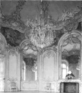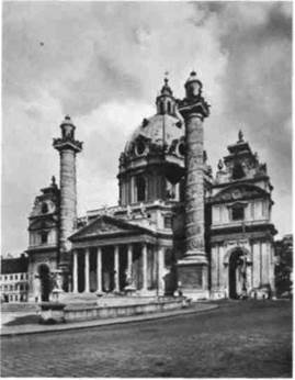 321. Жермен Боффран. Салон Принцессы в Отеле де Сюбиз в Париже. Начат в 1732 г. их архитекторам редко предоставлялась возмож ность создания впечатляющих по внешнему виду зданий. Поэтому их главной заботой становились расположение и убранство комнат. Для «отелей» требовался менее напыщенный и громоздкий, чем лебреновский, стиль внутреннего убранства. Назре ла потребность в более камерном, гибком стиле, дававшем возможность лучше приспосабливаться к индивидуальной фантазии, нетронутой класси цистическими догмами. Боффран. В ответ на эти запросы француз скими декораторами был создан стиль рококо («стиль Людовика XV», как его обычно называют во Франции). Название вполне подходит для этого стиля, хотя термин, который произошел от фран цузского слова «rocaille» (перекликаясь с италь янским «барокко»), означавшего игривое декори рование гротов раковинами и камнями неправиль ной формы, был придуман в целях насмешки. Действительно, стены и потолок Салона Принцессы в «Отеле де Сюбиз», декорированные Жерменом Боффаном (илл. 321), украшены инкрустированным орнаментом и мебелью с богатой резьбой. При таком подходе стирается различие между декором и функциональностью, как это видно по часам и статуэтке на камине на нашей репродукции. Фран цузская скульптура рококо обычно принимает РОКОКО • 333 форму небольших групп в «миниатюрном бароч ном» стиле. Рассчитанные на разглядывание вблизи, они напоминают игривые подражания экстазам Бернини и Пюже. Германия и Австрия К рококо относились и утонченные миниатюр ные подражания криволинейным, «эластичным» формам барокко Борромини и Гварини, которые смогли успешно вписаться в архитектуру Австрии и Германии, где итальянский стиль пустил крепкие корни. Архитектура рококо в Центральной Европе отличалась по сравнению с Францией большей масштабностью и изощренностью. Более того, жи вопись и скульптура здесь лучше увязывались с окружающей средой. Дворцы и церкви украшались расписными плафонами и декоративной скульпту рой, не подходящими для домашних интерьеров, как бы они ни были роскошны. Однако в них нашел отражение тот же вкус, что и в «Отеле де Сюбиз». Не удивительно, что стилю, возникшему в Италии, было суждено получить наивысшее раз витие к северу от Альп, где такой синтез готики и Возрождения должен был встретить особенно теплый прием (см. стр. 298—299)— В Австрии и южной Германии, обескровленных Тридцатилетней войной (1618—1648), количество вновь выстроенных зданий до начала XVII столетия оставалось незна чительным. Барокко считалось чужеземным стилем, к которому обращались в основном лишь заезжие итальянцы. Местные декораторы вышли на первые роли только к 1б90-м годам. Затем последовал период бурной творческой активности, который продолжался более полстолетия и позволил создать строения, относящиеся к числу наиболее ярких творений в истории архитектуры. Эти памятники были воздвигнуты для прославления князей и прелатов, которые, в общем-то, и заслужили память потомков только как щедрые покровители искусств. Фишер фон Эрлах. Иоганн Фишер фон Эрлах (1656—1723), первый великий представитель архитектуры рококо в Центральной Европе, явля ется переходной фигурой, связанной почти напря мую с итальянской традицией. В его проекте цер кви Св. Карла Борромео в Вене (илл. 322) сочета ется глубокое понимание стилистики Б