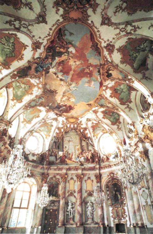 322. Иоганн Фишер фон Эрлах. Фасад церкви Св. Карло Борромео в Вене. 1716-1737 г. яна (см. илл. 97), заменяет здесь башни фасада, которые превращены в угловые павильоны, напо минающие двор Лувра (сравн. илл. 268). Исполь зованием этих лишенных гибкости элементов рим ского имперского искусства в криволинейных, ди намичных формах своей церкви, Фишер фон Эрлах смелее любого итальянского архитектора барочного стиля показывает способность христианства усва ивать и преобразовывать достижения античности. Нейман. Среди архитекторов следующего по коления наблюдалось тяготение к легкости и эле гантности. В епископской резиденции в Вюрцбурге, построенной по проекту Бальтазара Неймана (1687—1753), имеется захватывающий дух Кайзе ровский зал (илл. 323) — большой овальный ин терьер, в убранстве которого использована любимая цветовая гамма XVII столетия, состоящая из белого, золотого и оттенков пастели. Количество и эсте тическая роль конструктивных членений типа ко лонн, пилястров и архитравов сведены здесь до минимума. Окна и сегменты свода обрамлены сплошными поясами стукового декора, а поверх ности белого цвета покрыты орнаментами непра вильной формы. Этот набор кружевных мотивов, идущий от французского стиля (см. илл. 321), 334 • РОКОКО