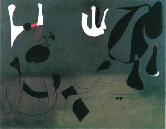 439— Хуна Миро. Живопись. 1933 г. Холст, масло. 130,2 х 161,3 см. Уэдсворт Атенеум, Хартфорд, Коннектикут. © Уэдсворт Атенеум. Собр. Эллы Гэллап Самнер и Мэри Кетлин Самнер туры способом «декалькомании» — переводом мас ляной краски на холст с какой-либо другой по верхности. На картине «Наряд невесты» (илл. 438) он создал таким образом удивительно богатый образный мир, заставляющий нас разгадывать его содержание. Картина выглядит неким подобием мечты, но мечты, родившейся именно в порази тельно романтическом воображении (сравн. «При зрак» Моро, илл. 397). Миро. В сюрреализме было, однако, и гораздо более смелое и творческое ответвление. К нему имеют отношение некоторые работы Пикассо (на пример, «Три танцовщицы», илл. 433), а самым видным его представителем стал тоже испанец — Хуан Миро (1893—1983), автор удивительной кар тины «Живопись» (илл. 439)— Его творческая манера получила название «биоморфной абстракции» за текучесть и криволинейность композиций, напоминающих органические, а не геометрические формы. Возможно, еще более точным названием было бы «биоморфное отвердение», так как формы на картинах Миро живут собственной, энергичной жизнью. Они словно трансформируются на наших глазах, то расширяясь, то сжимаясь, как амебы, пока не приобретают сходство с человеческими чертами настолько, что это удовлетворяет худож ника. Такое спонтанное «становление» представ ляет собой полную противоположность абстракции как мы ее определили выше (см. стр. 420—421), хотя в следовании формальным принципам пост роения композиции Миро не менее строг, чем кубисты,— по существу, он и начинал как кубист. Клее. Немецко-шведский художник Пауль Клее (1879—1940) также находился под влиянием ку бизма, но для него не менее живой интерес пред ставляли этнографическое искусство и детские ри сунки. Во время Первой мировой войны он сумел сплавить эти казалось бы несоединимые элементы, ЖИВОПИСЬ XX ВЕКА • 435