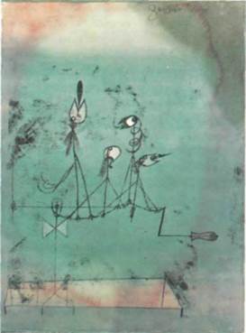 440. Поль Клее. Щебечущая машина. 1922 г. Бумага, наклеенная на картон, акварель, тушь, перо по переводному рисунку маслом. 63,8 х 48 см. Музей современного искусства, Нью-Йорк. Приобретена создав свой собственный, восхитительно экономный и точных художественный язык. «Щебечущая ма шина» (илл. 440) — изящный перьевой рисунок, тронутый акварелью,— дает представление о свое образии искусства Клее. Несколькими простыми линиями он создал призрачный механизм, имити рующий поющих птиц и одновременно высмеива ющий как нашу веру в чудеса индустриальной эпохи, так и сентиментальные восторги пением птиц. Миниатюрное сооружение не лишено угрю мости: головы четырех механических птичек вы глядят наподобие рыболовных приманок, словно на них можно ловить настоящих птиц. Таким образом, в созданном на рисунке поразительном изобретении сконцентрирован целый комплекс идей о современной цивилизации. Важную роль здесь играет название. Это во обще характерно для Клее, собственно работа ко торого, при всей ее зрительной привлекательности, не раскрывает до конца творческого замысла, пока сам художник не объяснит его нам. Название, в свою очередь, без произведения мало что значит — остроумная идея щебечущей машины ничего не говорит нашему воображению до тех пор, пока мы не увидим эту конструкцию. Подобная взаи мозависимость знакома нам по мультфильмам. Клее поднимается на высокий художественный уровень, не теряя игрового характера этих словесно-зрительных каламбуров. Искусство было для него языком знаков, языком форм, являющихся образами идей, точно так же, как форма буквы является образом определенного звука или как стрела — образом, означающим команду: «Только в эту сторону!» Он понял также, что в любой условной системе знак — не более, чем «спусковой крючок». При взгляде на этот знак мы автоматически вкладываем в него определенное значение, не переставая размышлять о его форме. Клее хотел, чтобы его знаки, приходя как визуальные факты в столкновение с нашим сознанием, одновременно играли и роль «спускового крючка».