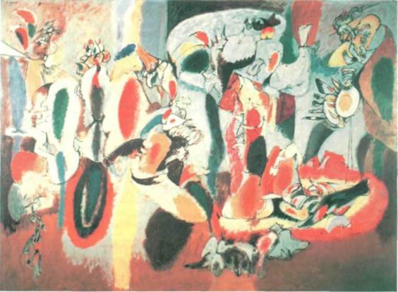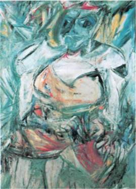 447. Ли Крэснер. Праздник. 1959-1960 г. Холст, масло. 2,34 х 4,99 м. Частное собрание. По разрешению Галереи Роберта Миллера, Нью-Йорк Те конкретные формы, которые мы видим на воспроизведенной картине, в значительной мере обусловлены внутренней динамикой материала и живописной техникой художника: вязкостью пигмента, скоростью и направлением наложения краски на холст и ее взаимодействием с другими слоями. В результате возникает такая выразительная, насыщенная поверхность холста, что вся пре- жняя живопись просто бледнеет перед нею. Когда художник «целится» краской в холст, вместо того, чтобы «нести» ее на кончике кисти — или, если угодно, высвобождает силы, кроящиеся в краске, придавая ей импульс собственного движения,— он не просто выдавливает ее, полагаясь в остальном на волю случая. Художник сам является для этих высвобождаемых сил высшим источником энергии, ЖИВОПИСЬ XX ВЕКА • 441 и он «седлает» их, как ковбой мог бы оседлать дикую лошадь, в неистовстве психо-физиологичес кого действа. Ему не всегда удается удержаться в седле, но восторг этого состязания, при котором задействуются все силы его организма, стоит риска. В этом сравнении, при некоторой его грубоватости, отражается главное различие между Поллоком и его предшественниками: его полная самоотдача процессу живописи. Именно поэтому он предпочи тает крупные полотна, обеспечивающие достаточно обширное «поле боя» и позволяющие участвовать в создании картины не только руками, но и движениями всего тела. Термин «живопись действия» передает суть такого подхода гораздо лучше, нежели «абстрак тный экспрессионизм». Упрекающим Поллока в недостаточном контроле над материалом можно возразить, что эта утрата более чем компенсируется обретением новой целостности и размахом творческого процесса, придающим его творчеству несомненный отпечаток искусства середины XX столетия. Применяемая Поллоком техника выжи мания краски не была, однако, главной особен ностью «живописи действия», и он сам перестал прибегать к ней в 1953 году. Краснер. Ли Краснер (1908—1984) — жена Пол лока — всегда писала кистью. Хотя Краснер и Поллок явно влияли друг на друга, она неизменно стремилась к творческой самостоятельности. Од нако ей удалось выйти из-под его длинной тени лишь после того, как она сменила несколько на правлений, уничтожив значительную часть своих ранних работ. После смерти Поллока ей удалось найти свое направление, которому она стремилась следовать в последние три года жизни: снова вер нуть в абстрактный экспрессионизм человеческую фигуру, сохранив автоматизм письма. Потенциаль но такая возможность всегда присутствовала в творчестве Поллока — изображение в «Осеннем ритме» мы легко можем принять за образы неистово кружащихся людей. Такие рождающиеся из переплетений линий формы Краснер выявляет в свой картине «Праздник» (илл. 447), используя размашистые движения «живописи действия» для придания этим образам некоторого сходства с че ловеческим обликом, но не переходя к собственно изображению. Де Коонинг. В творчестве Виллема де Коо нинга (род. 1904) — другого видного мастера этой группировки и близкого друга Горки — всегда сохраняется связь с образным миром, независимо от того, присутствуют там фигуративные объекты
