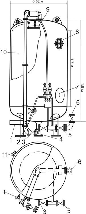 Рис 1. катіонітовий фільтр. 1 – подача води; 2 – подача регенераційного розчину; 3,4 – подача та спуск промивної води; 5 – скидання води; 6 – вихід пом'якшеної води; 7,8 - лаз для завантаження і вивантаження цеоліту; 9 – розподільний пристрій; 10 – шар катіоніту; 11 – штуцер для гідравлічного вивантаження катіоніту.