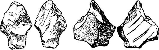Рис. 3.6. Вид спереди и сзади двух каменных орудий из формации Красной скалы в Фоксхолле, Англия. По своему возрасту образцы относятся к периоду позднего плиоцена. По поводу левого образца Генри Фэрфилд Осборн сказал: «С двух сторон показано остроконечное каменное орудие, сколотое сверху и снизу и с суженным основанием, найденное на шестнадцатифутовом (около 5, 5 метра) уровне фоксхолского разреза. Примитивный стреловидный тип орудия. Мог использоваться во время охоты». Относительно правого образца Осборн написал: «Бур с шестнадцатифутового уровня Фоксхолла».