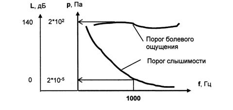 где I0 и ро - интенсивность и звуковое давление на пороге слышимости. Пороговые значения интенсивности и звукового давления стандартизированы: l 0 = 10-12Вт/м2, а р0 = 2* 10-5Па. Уровень интенсивности звука L численно равен уровню звукового давления (УЗД). Эти величины - синонимы. Уровень звукового давления называют уровнем шума. Зона слышимости звука ограничена двумя кривыми: порогом слышимости и порогом болевого ощущения (рис. 1).