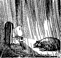 Свет от его фонаря упал на дорожку, и в нем, как алмазы, засверкали капли дождя, – Господи боже, кто это? – вскрикнул папа‑тролль, увидев перед крыльцом какое‑то жалкое мокрое существо с блестящими черными глазами. – Это я, Ондатр, – слабым голосом сообщило жалкое существо. – Извините, что побеспокоил вас по пустякам… Дело, видите ли, в том, что при постройке моста вы разрушили мой дом под берегом речки. Разумеется, с философской точки зрения совершенно безразлично, жив ты или нет… Только кто знает, что со мной станется после такой простуды… – Какая жалость! – сказал Муми‑папа. – Я и не подозревал, что вы проживаете под мостом. Заходите, ради бога. Жена наверняка сможет устроить вам где‑нибудь постель, – Постели меня не волнуют – это ненужные предметы обстановки, – смиренно заметил Ондатр. – Я жил в простой норе и чувствовал себя в ней прекрасно. Конечно, с философской точки зрения безразлично, как ты себя чувствуешь, но, вообще‑то говоря, это была хорошая нора. Ондатр стряхнул с себя воду и прислушался. – Что это за дом? – спросил он. – Самый обыкновенный дом, – вежливо ответил Муми‑папа. – Я сам построил его. Смею ли предложить вам рюмку вина? От простуды. – Собственно говоря, это не обязательно, – сказал Ондатр. – Но, пожалуй. Муми‑папа на цыпочках пробрался в кухню и открыл в темноте шкафчик с вином. Он потянулся за бутылкой пальмового вина, стоявшей на верхней полке, потянулся еще и еще и вдруг – раз! – смахнул на пол салатницу. Раздался страшный дребезг. Дом ожил: послышались крики, хлопанье дверей, и в кухне появилась Муми‑мама со свечой в лапе. – А, это ты, – сказала она. – А я уж думала, к нам вломились разбойники. – Я хотел достать пальмовое вино, – сказал Муми‑папа. – Какой осел поставил эту проклятую салатницу на самый край? – Ну и хорошо, что она разбилась, она была ужасно некрасивая, – сказала Муми‑мама. – Стань на стул, так будет удобней. Муми‑папа забрался на стул и достал бутылку и три рюмки. – А третья для кого? – удивилась Муми‑мама. – Для Ондатра, – ответил папа. – Он остался без квартиры и переселяется к нам. На веранде зажгли керосиновую лампу, и все выпили за знакомство. Муми‑троллю и Сниффу тоже разрешили присутствовать, несмотря на поздний ночной час. Дождь не переставая барабанил по крыше, ветер разбушевался еще пуще. Он выл в дымовой трубе, и дверцы печки испуганно звенькали. Ондатр уткнулся носом в оконное стекло и мрачно глядел во тьму. – Это неестественный дождь, – сказал он. – А разве такие бывают? – удивилась Муми‑мама. Ондатр помолчал немного, грустно обмакнул усы в вино и сказал: – Почем знать… В воздухе что‑то есть – какие‑то предвестья… Мне‑то, разумеется, все равно, произойдет что‑нибудь или не произойдет, но совершенно несомненно – что‑то должно произойти. – Что‑нибудь страшное? – вздрогнув, спросил Снифф. – Почем знать, – повторил Ондатр. – Вселенная так велика, а Земля так ничтожно мала и убога… – Мне кажется, всем нам лучше лечь спать, – поспешно проговорила Муми‑мама, заметив, что Снифф весь дрожит. Каждый свернулся на свой лад, как привык спать, и стал ждать сна и тепла. А тучи до самого утра мчались по небу, ветер хлестал мокрый сад, и дождь лил, лил и лил…
