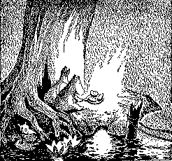 – Крокодилы! – крикнул Муми‑тролль и бросился к рулю. – Не дай бог, голодные… Над водой засверкали бледно зеленые глаза чудовищ, вот они покрыли собой всю реку… Крокодилы со всех сторон окружили плот, вот уж река почернела от их тел, но все новые тени бросались в воду с берегов. Снифф сидел, окаменев от страха, и не сводил с крокодилов глаз. Но когда один из них высунул морду у самой кормы, он потерял самообладание и хватил чудовище веслом по голове. Что тут поднялось! Буйно захлестали по воде бесчисленные хвосты, широко разверзлись здоровенные пасти с двумя рядами острых, как иглы, зубов. Плот закачался… Муми‑тролль и Снифф вцепились в мачту и громко закричали: «Караул!» В это мгновение с берега потянул ветерок, плот вынесло на стрежень, и он быстро поплыл вниз по течению. Распахнув пасти, крокодилы устремились за ним. Снифф закрыл лицо лапами, а Муми‑тролль, едва соображая от страха, что делает, схватил сверток с брюками и запустил им в преследователей. Крокодилы моментально набросились на добычу и разорвали ее на тысячу клочков. Они так яростно дрались между собой, что и не заметили, как плот ускользнул, а когда шерстяные брюки были съедены, Муми‑тролль и Снифф были уже так далеко, что догонять их не имело смысла. – Честь и хвала брюкам, – сказал Муми‑тролль. – Ну как, доволен ты этим маленьким приключением? – Ты тоже кричал «Караул», – отпарировал Снифф. – Разве? – спросил Муми‑тролль. – А я и не заметил… Во всяком случае, мама была права: брюки действительно пригодились. Над рекой уже клубилась вечерняя мгла, и они направили плот к берегу. Там между корнями деревьев они нашли уютное местечко и разожгли костер. Они пекли блины и с пылу с жару отправляли их в рот. (Это единственно разумный способ есть блины.) Затем они забрались в спальные мешки, и ночь опустилась над ними.