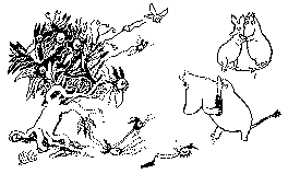 Снусмумрик, Снифф, Снорк и его сестра глядели на этот жестокий бой, не смея перевести дух. Муми‑тролль скакал туда‑сюда, яростно молотил хвостом и время от времени делал выпады в сторону машущего руками Ангостуры. Вот одна из его зеленых рук обвилась вокруг носа Муми‑тролля, и из груди зрителей вырвался крик ужаса. Но вот Муми‑тролль одним махом отсек ее, и крик ужаса перешел в торжествующий вопль. А схватка закипела с новой силой, Куст весь трясся от негодования, Муми‑тролль пылал от гнева и усилий. Зрители долго не могли ничего разобрать в яростном мелькании ветвей, хвостов и ног. Фрекен Снорк дрожащими лапами подняла большущий камень и запустила им в ядовитый куст, Но так как стрелок она была никудышный, камень угодил прямо в живот Муми‑троллю. – Я убила его! – зарыдала она и закрыла ланами лицо. – Чего хорошего ждать от девчонки, – едко заметил Снифф. Но Муми‑тролль вовсе не был убит, он дрался как никогда и одну за другой отшибал ножиком руки Ангостуры. И лишь когда от того остался голый пенек, сложил ножик и сказал (на взгляд Сниффа, ужасно надменно): – Вот так‑то. – О, какой ты храбрый! – прошептала фрекен Снорк. – А, ерунда! Со мной такое бывает чуть ли не каждый день, – как бы невзначай бросил Муми‑тролль. – Странное дело, – заметил Снифф. – Я что‑то никогда… Но он не успел договорить: Снусмумрик больно наступил ему на ногу, так что он даже вскрикнул. – Ой, что это? – вздрогнула фрекен Снорк. Она еще не пришла в себя после такого ужасного переживания. – Не бойся, – сказал Муми‑тролль. – Теперь я с тобой, я сумею защитить тебя от любой опасности, А еще у меня есть для тебя небольшой подарок. И он достал золотой браслет. – Ах! – воскликнула фрекен Снорк и порозовела от восторга. – А я‑то думала, л его потеряла… Мне ужасно приятно… Где ты его нашел?