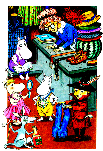 Пока они по очереди держали друг перед другом зеркальце, колокольчик снова прозвонил, и вошёл Снусмумрик. – Я думаю, будет лучше, если брюки немного состарятся, – сказал он. – А так они совсем не в моём стиле. – Жаль, – сказала старушка. – Но, может быть, тебе нужна новая шляпа? Снусмумрик испуганно натянул свою старую шляпу на самые уши. – Большое спасибо, – сказал он. – Но я как раз подумал, что очень опасно обременять себя лишней собственностью. Снорк всё это время сидел и что‑то писал в тетрадке. Потом он поднялся и сказал: – Когда речь идёт о кометах, то следует помнить следующее правило: «Не стоит подолгу задерживаться в магазинах». Снифф! Давай по‑быстрому, кончай со своим лимонадом! Снифф одним духом вылил в себя всё, что было в бутылке, и, как можно было ожидать, лимонад попал не в то горло. Послышался какой‑то непонятный звук, и лимонад выплеснулся на коврик. – Меня стошнило, – объявил Снифф. – Вот он всегда так, – проворчал Муми‑тролль. – Ну пошли понемножку. – Сколько с нас за всё? – спросил Снорк. Старушка принялась подсчитывать, и, пока она считала, Муми‑тролль вдруг сообразил, что у него совсем нет никаких денег. Он сделал знак бровями всем остальным и по их носам понял, что у них решительно ничего нет. Нечего сказать, положеньице! – Сорок пенни за тетрадку и тридцать четыре за лимонад, – сказала старушка. – Звезда стоит три марки, зеркальце – пять, потому что там на обороте – рубины. Всё вместе составляет восемь марок и семьдесят четыре пенни[1]. Воцарилось молчание. Фрёкен Снорк со вздохом положила зеркальце на прилавок, а Муми‑тролль начал развязывать ленточку, на которой висела звезда. Снифф задумчиво поглядел на мокрый от лимонада коврик. А Снорк никак не мог решить, подорожала или подешевела тетрадка, после того как он её наполовину исписал. Старушка поглядела на них поверх очков. – Вот что, мои хорошие, – сказала она. – У нас есть ещё штаны, которые Снусмумрик решил не брать. Они стоят как раз восемь марок, так что вы мне, по сути дела, ничего не должны. – Как же это? – спросил Муми‑тролль. – Разве так правильно? – Конечно, правильно, – сказала старушка. – Мне же остаются штаны. Снорк попробовал подсчитать в уме, но у него ничего не получилось. Тогда он написал в тетрадке: