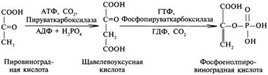 àпреобразование всех указанных веществ (кроме глицерина) в глюкозу проходит через стадию пировиноградной и щавелевоуксусной кислот. Образование фосфоенолпирувата из пирувата. Первоначально пируват под влиянием пируваткарбоксилазы и при участии СО2 и АТФ карбоксилируется с образованием оксалоацетата: Затем оксалоацетат в результате декарбоксилирования и фосфорилирования под влиянием фермента фосфоенолпируваткарбоксилазы превращается в фосфоенолпируват.