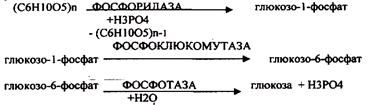Распад гликогена Может идти 2 путями: 1. ОСНОВНОЙ ФОСФОРОЛИТИЧЕСКИЙ ПУТЬ Он протекает в печени, почках, эпителии кишечника. Схематично можно записать в виде 3 реакций.