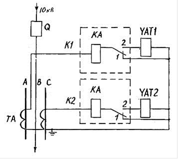 Рис. 2.5. Схема максимальной токовой защиты на реле типа РТ-85: К.1, К.2 - реле тока типа РТ-85; Q - выключатель в линии 10 кВ; ТА - трансформатор тока