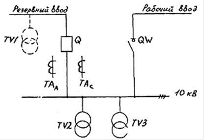 Рис. 2.7. Схема ЗТП-10/0,4 кВ: TV - трансформатор напряжения ТА - трансформатор тока; Q - выключатель 10 кВ; QW - выключатель