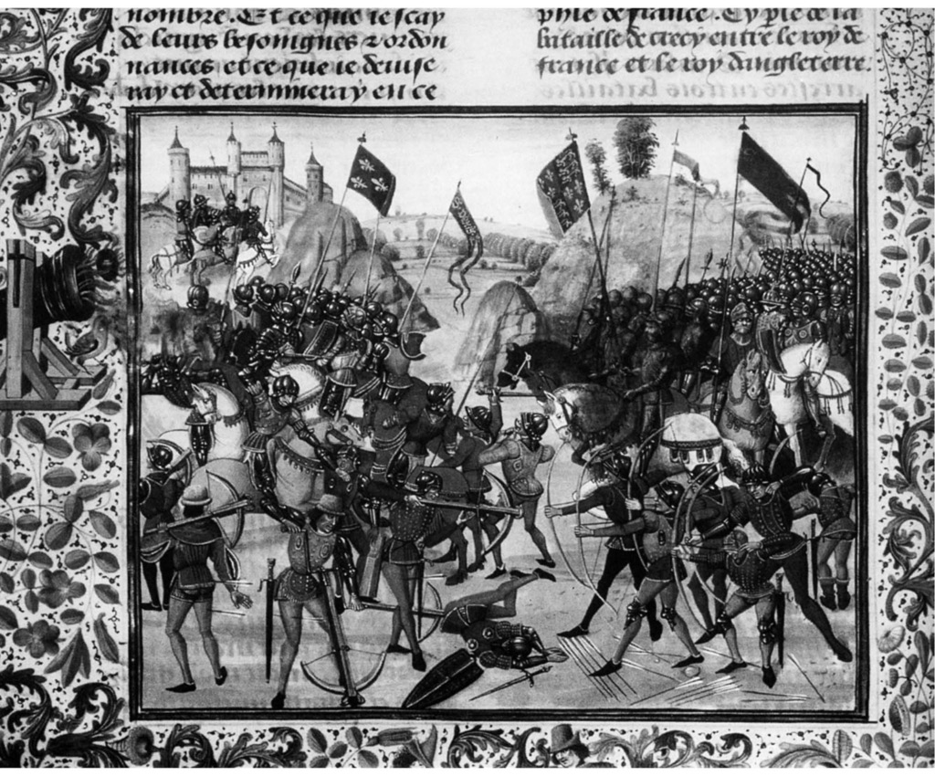 Фрагмент манускрипта с изображением битвы при Креси, ставшей триумфом английских лучников. Накануне боя шел дождь, и английские стрелки предусмотрительно сняли тетиву с луков, чтобы она не пострадала от влаги. Французские арбалетчики не могли этого сделать, и их оружие было бесполезно в сражении. В левой части картины изображена пушка, образец нового оружия, которое впоследствии изменит облик войны