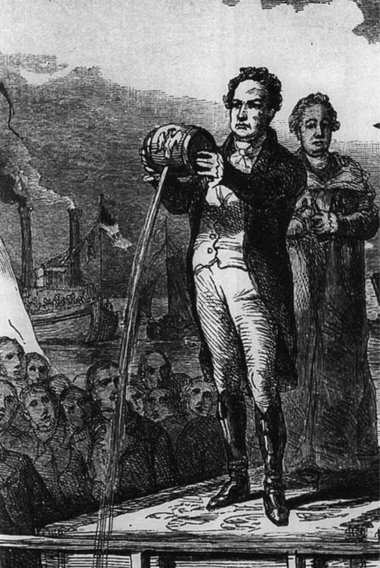 Открытие канала Эри 25 октября 1825 года губернатором Девиттом Клинтоном. Он торжественно выливает бочонок воды из озера Эри в Гудзонский залив. Канал, названный восьмым чудом света, пролегал между городами Баффало и Олбани и насчитывал 83 шлюза