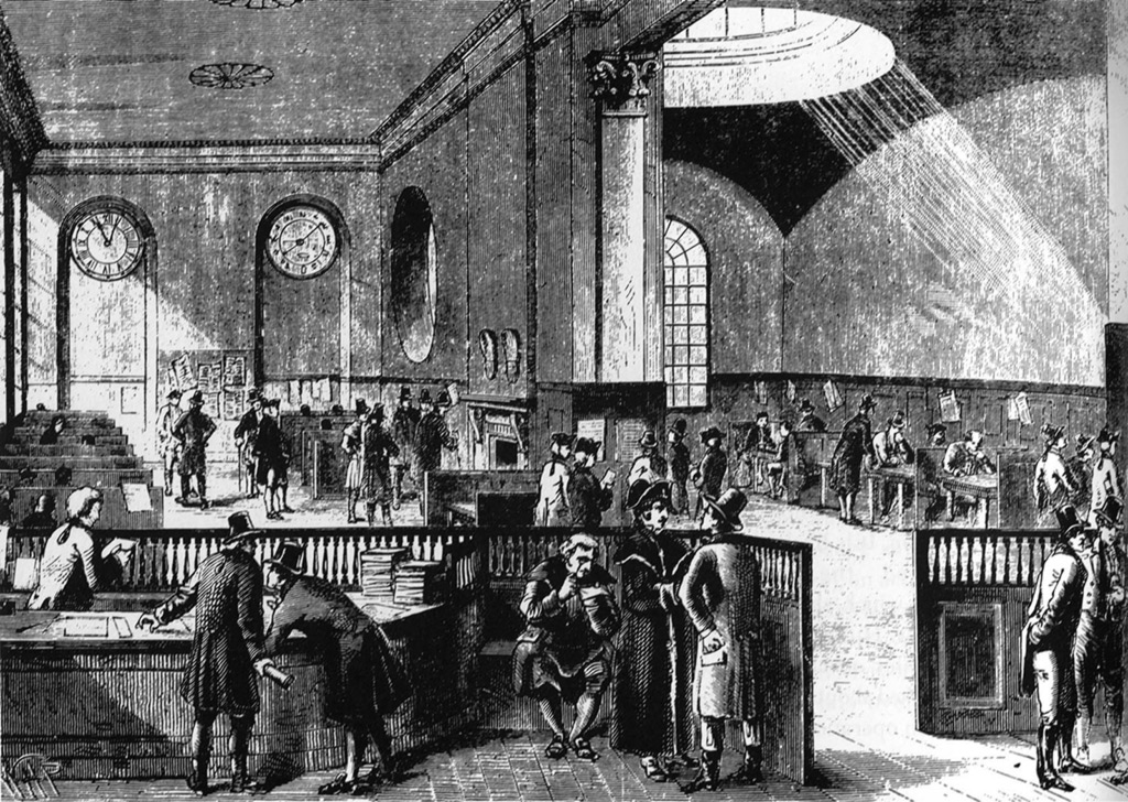 Зал заключения договоров в Страховой компании Ллойда в Лондоне. Страховщик подписывался в страховом договоре и указывал сумму покрытия, которую он готов предоставить. Развитию международного страхования способствовало появление стабильного международного законодательства по урегулированию споров между представителями разных государств
