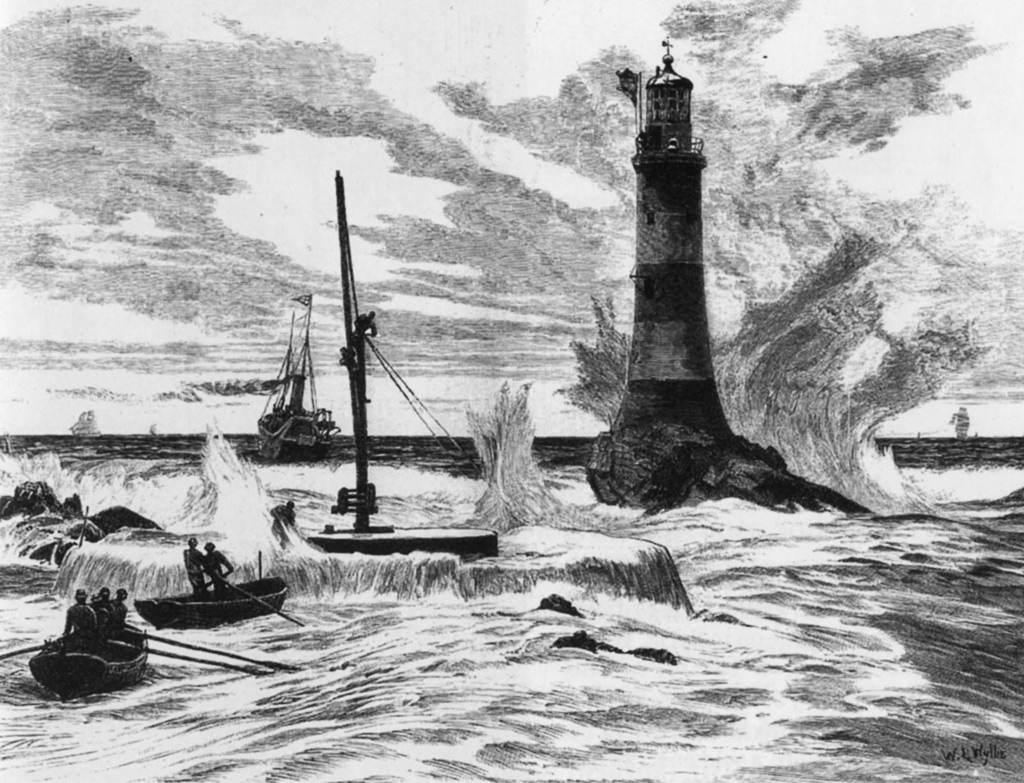 Эддистонский маяк Смитона (гравюра 1879 года). Инженер собственноручно ввинтил позолоченный шар, украшаюший купол маяка. Свет давали двадцать пять шестифунтовых свечей. Маяк был виден на расстоянии пяти морских миль. Он простоял сто двадцать лет и был заменен на новый в 1882 году (первые конструкции новой постройки видны на переднем плане)