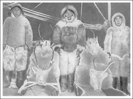 Отлично выспавшись, мы с утра пораньше двинулись в путь, прошли по льду залива Портер к его вершине и, взяв в сторону суши, пересекли 5-мильный перешеек, разделяющий залив Портер и бухту Джемс-Росс. Каждый фут этого маршрута был мне знаком и овеян воспоминаниями. За перешейком мы вновь спустились на лед и быстро помчались вдоль западного берега. Собаки, сытые и отдохнувшие, бежали рысцой, навострив уши и подняв торчком хвосты; погода была хорошая; солнце, низко висевшее над горизонтом, отбрасывало на лед длинные, фантастические тени людей и собак. Внезапно зоркие глаза Эгингва заметили движущуюся точку на склоне горы слева от нас. «Тукту!» – вскрикнул он, и весь наш отряд немедленно остановился. Зная, что преследование одиночного оленя – дело не скорое, я не бросился тотчас в погоню, а велел моим крепким, длинноногим юношам Эгингва и Ублуя взять винчестеры и попытать счастья. Через мгновение они уже мчались во весь дух по снегу, словно нетерпеливые собаки, сорвавшиеся с постромок, низко пригибаясь к земле. Бежали они с таким расчетом, чтобы пересечь путь оленю чуть дальше по склону. Я наблюдал за ними в бинокль. Олень, заметив их, неторопливо побежал в другую сторону, то и дело оглядываясь назад и явно насторожившись. Но вот он повернулся к ним мордой и стал как вкопанный, и я понял, что охотники издали магический клич, из поколения в поколение завещаемый отцом сыну, подражательный клич, при котором олень мгновенно останавливается, – особый свистящий звук, напоминающий шипение кошки, только более продолжительный.