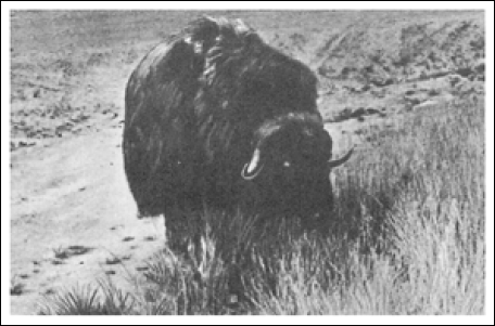Последний экземпляр представлял особый интерес, так как белая шерсть у него на ногах, над самыми копытами, была испещрена ярко-рыжими отметинами – с таким животным я сталкивался впервые. Забрав собак, я направился к тому месту где мы решили заночевать. Ублуя и Кулатуна как раз заканчивали разделку последнего быка, и я тотчас послал их с санями помочь Эгингва управиться с остающимися двумя. Когда они уехали, я разбил палатку и начал готовить чай к ужину. Как только голоса эскимосов послышались вдали, я поставил вариться мясо мускусных быков, и вскоре мы наслаждались плодами своих трудов. Вот уж поистине мы ели тук земли – оленину в позапрошлую ночь, медвежатину в прошлую, а сегодня сочное мясо мускусных быков! Наутро мы двинулись дальше и в течение дня убили еще трех мускусных быков, мясо которых спрятали, как положено. В ту ночь мы ночевали во внутренней части неисследованного залива, и я заснул с приятным сознанием, что к карте мира прибавился еще один кусочек дотоле неизвестной территории. На следующий день мы направились на север вдоль западного берега залива. После нескольких часов езды мы уже начали присматривать подходящее место для ночевки, как вдруг напротив подножия крутого утеса футов в 50 высотой собаки кинулись в сторону берега и стали карабкаться на утес. Разумеется, им это не удалось из-за саней, но мы поняли, что означал этот сумасшедший рывок. Снова мускусные быки! Через мгновение я и Эгингва с винтовками в руках уже карабкались на утес. Заглянув через его вершину, мы увидели стадо из пяти быков. Было почти совсем темно – в густых арктических сумерках различались лишь пять черных точек. Мы переждали с минуту, чтобы отдышаться, затем я махнул рукой Ублуя, давая понять, чтобы он поднялся к нам с двумя собаками, а Кулатуна остался у саней. Несмотря на потемки, мы быстро управились со всем стадом.
