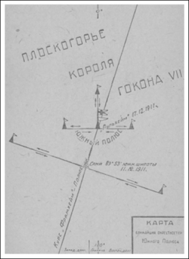 Тем временем мы с Ханссеном занялись разными текущими делами. Надо было уладить кое-какие мелочи, а затем приготовиться к серии наблюдений, которые мы хотели провести сообща, чтобы возможно точнее и лучше определить свои координаты. Первое же наблюдение показало, насколько это было необходимо. Измерение высоты, вместо того чтобы дать большую высоту по сравнению с полуночным наблюдением, дало меньшую, и нам стало ясно, что мы отклонились от того меридиана, по которому, как нам казалось, следовали. Теперь надо было прежде всего определить линию север – юг и широту, чтобы ориентироваться. К счастью для нас, было похоже, что хорошая погода продержится. Начиная с 6 часов утра до 7 вечера, мы каждый час измеряли высоту солнца, и эти наблюдения позволили нам более или менее надежно вычислить свою широту и установить направление меридиана. Около 9 часов утра мы начали уже ожидать возвращения товарищей. По нашим расчетам, к этому времени они должны были пройти все 40 километров. Только в 10 часов Ханссен заметил на горизонте первую черную точку, а затем вскоре показались вторая и третья. Каждую точку мы встречали вздохом облегчения. Все трое вернулись к палатке почти одновременно. Мы сообщили им предварительный итог своих наблюдений. Судя по всему, наш лагерь находился примерно на 89°54 30 ' южной широты; значит, самый полюс должен был попасть в захваченную нами площадь. Мы могли бы вполне довольствоваться этим результатом, но так как погода была хорошая и вроде бы не собиралась портиться, а наш запас продовольствия после тщательной проверки оказался весьма обильным, мы решили пройти оставшиеся 10 километров и произвести определение места возможно ближе к самому полюсу. А пока три путника улеглись спать – не столько потому, что они устали, сколько потому, что так полагалось; тем временем мы с Ханссеном продолжали наблюдения. Во второй половине дня мы еще раз придирчиво проверили свой запас продовольствия, чтобы затем повторно обсудить наши дальнейшие действия. Оказалось, что продовольствия для нас и для наших собак хватит на 18 дней. Оставшиеся 16 собак были разделены на две упряжки по 8 собак в каждой, а поклажа саней Бьоланда распределена по саням Ханссена и Вистинга. Разгруженные сани поставили на попа, и вышла прекрасная веха. Прикрепленный к ним одометр мы не стали снимать. На обратном пути вполне можно обойтись двумя одометрами. Все эти приборы показали себя очень точными. Мы оставили также 2–3 пустых ящика. На одной из досок я записал карандашом, что нашу палатку «Пульхейм» нужно искать в направлении NWtW, в 5,5 мили (10 километрах) от саней. Закончив все эти дела в тот же день, мы с удовлетворением легли спать. На другой день, 17 декабря, рано утром мы снова тронулись в путь. Бьоланду, который покинул сословие каюров и с восторгом был принят в сословие направляющих, сразу же было поручено главное и почетное задание вести экспедицию к самому полюсу Это задание, которое мы все считали делом чести, я поручил ему в знак благодарности славным жителям Телемарка за их выдающийся вклад в развитие лыжного спорта. В этот день особенно важно было прокладывать совершенно прямую лыжню и, по возможности, точно держаться вычисленного нами меридиана. На некотором расстоянии за Бьоландом следовал Хассель, за ним Ханссен, потом Вистинг и поодаль – я. Это позволяло м