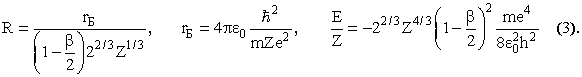 Здесь первое слагаемое - энергия притяжения Z электронов к ядру, второе - энергия отталкивания (Z-1)Z/2 электронных пар (попрежнему R/β - среднее расстояние между электронами), третье - оценка суммарной кинетической энергии всех электронов. Заменив Z(Z-1) на Z2, получим