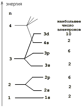 Z = 1 (водород). В этом атоме имеется один электрон в состоянии с квантовыми числами n = 1, l = 0, ml = 0, ms = +1/2 или -1/2. Энергия ионизации Ei= 13.6 эВ. Среднее расстояние электрона от ядра составляет около 0.75·10-10 м. Об этом атоме и его свойствах - отдельная лекция. Z = 2 (гелий). Два электрона находятся в состоянии с квантовыми числами n = 1, l = 0, ml = 0, ms = +1/2 и -1/2 (т.е. два 1s электрона). Волновые функции, описывающие их состояние, несколько отличаются от водородных по форме из-за кулоновского отталкивания электронов, но главное отличие в масштабах величин. Для иона гелия из выражения (4), где есть множитель Z2, видно, что энергия связи электрона составит 54.4 эВ. Характерное расстояние электрона от ядра составит 0.53·10-10/Z м. В атоме гелия с двумя электронами из-за их отталкивания энергия ионизации составляет 24.6 эВ (нечто среднее между 13.6 для водорода и 54.4 для He+). Это самое большая величина для всех химических элементов. Оторвать электрон у атома гелия очень трудно, и в 1s состоянии нет вакантных мест. Поэтому гелий химически инертен, не образует молекул ни содним элементом. Z = 3 (литий). В 1s состоянии находится два электрона, и принцип Паули запрещает поместить туда третий. Этот электрон находится в состоянии с n = 2 (2s) на большем удалении от ядра и с гораздо большей энергией (т.е. существенно меньшей энергией связи). Среднее удаление электрона от ядра так велико, что в первом приближении ядро и два электрона в 1s состоянии можно рассматриватькак точечный остов с зарядом +e. Третий электрон тогда с n = 2 должен иметь энергию (формула (4)) -13.6/4 = -3.4 эВ. Действительное значение -5.4 эВ, т.е. и правда малое (приближение не слишком плохое). Малое значение энергии ионизации означает, что литий имеет очень высокую активность. Размеры и энергии атома подтверждены надежными измерениями. Z = 4 (бериллий). Электронная конфигурация - 1s22s2. Из-за увеличения Z энергия ионизации больше, чем для лития, и составляет 9.3 эВ. Для отрыва второго электрона в состоянии n = 2 надо затратить не на много больше, поэтому в химических соединениях бериллий имеет валентность +2. Z = 5 (бор). Электронная конфигурация - 1s22s22p1. Энергия ионизации 8.3 эВ (меньше, чем у бериллия). С одной стороны заряд ядра увеличился, с другой в 2p-состоянии энергия больше, чем в 2s. Второй фактор сильнее и, отделить электрон в 2p-состоянии легче. Валентность +3. ... Z = 7 (азот), Z = 8 (кислород), Z = 9 (фтор). У атомов этих элементов не хватает трех, двух и одного электрона, соответственно, до заполнения оболочки с n = 2, а именно 2p состояния. Эти атомы химически электроотрицательны, т.е. в химических соединениях захватывают электроны. "Лишние" электроны оказываются связанными с ядром так же, как и остальные в 2p состоянии (хотя связь всех 2p электронов несколько меньше, чем в нейтральном атоме, из-за увеличения электрон-электронного отталкивания). Z = 10 (неон). Все 10 возможных состояний с n = 1 и n = 2 заняты. Электронная конфигурация - 1s22s22p6. Энергия ионизации, пости непрерывно возраставшая, начиная с лития, составляет 21.6 эВ. Оторвать электрон трудно, и добавить тоже, т.к. дополнительный электрон должен был бы находиться в состоянии с n = 3 на большом удалении от ядра. Подобно гелию неон химически весьма инертен. В элементах с Z = 11 (натрий) по Z = 18 (аргон) заполняются состояния 3s и 3p и по химическим свойствам они схожи с соответствующими элементами второго ряда (литий - неон). Z = 19 (калий) и Z = 2