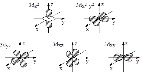 · Наконец, для нахождения максимального числа электронов, могущих быть в данном слое, необходимо суммировать электроны всех оболочек этого слоя. Для слоя с главным квантовым числом n это будут оболочки с ℓ =0, 1, 2, 3, …, n –1. Следовательно, ёмкость слоя составит: · · Методом математической индукции легко показать, что эта сумма равна 2n2. Отсюда максимальное число электронов составит: в первом слое (К-слое) 2; во втором слое (L-слое) 8; в третьем слое (М-слое) 18 и т.д. · Энергия электрона в атоме водорода (теория Бора) определяется единственным (главным) квантовым числом, а в многоэлектронном атоме – главным и орбитальным квантовыми числами. В целом энергия электрона возрастает по мере роста суммы названных квантовых чисел при доминирующем значении главного квантового числа. При одинаковой сумме энергия состояния с меньшим значением главного квантового числа ниже. В соответствии с этими правилами энергетический ряд атомных орбиталей выглядит следующим образом: · 1s < 2s < 2p < 3s< 3p < 4s < 3d < 4p < 5s < 4d < 5p < 6s < · < 4f < 5d < 6p < 7s < 5f < 6d < 7p … · Для изображения атомных орбиталей используют значения волновой функции или её квадрата (точнее угловой части этой функции). Поскольку электронная орбиталь в принципе распространяется до бесконечности, то изображают её часть (например, 80 или 90%). На рис. 1.5 представлены формы 1s-, 2p- и 3d-орбиталей. · 1s-орбиталь сферически симметрична, знак соответствующей функции одинаков в разных частях системы координат. Три 2p-орбитали представляют собой объёмные гантелеобразные фигуры, прошитые соответствующими осями координат. Четыре из пяти 3d-орбиталей представляют собой двугантельные образования, различно ориентированные в пространстве. Знаки соответствующих функций для гантелей различны. Пятая 3d-орбиталь представляет собой массивную гантель, насаженную на ось z, и тороидальную катушку в плоскости xy. · Узловой поверхностью орбитали называют геометрическое место точек, где Ψ=0 (Ψ2=0). Узловые поверхности могут быть сферическими, плоскими и коническими. По определению каждая орбиталь имеет сферическую узловую поверхность с бесконечным радиусом. · Главное квантовое число равно общему числу узловых поверхностей данной орбитали. Например, любая из 3d-орбиталей имеет одну сферическую узловую поверхность и две плоские (две конические – для · Побочное квантовое число равно числу узловых поверхностей орбитали, проходящих через начало координат. Например, любая из пяти · · · · Рис. 1.5. Формы 1s, 2p и 3d-орбиталей · · 3d-орбиталей (ℓ=2) имеет по две узловые поверхности, проходящие через начало координат. · Отметим, что формы ns-орбиталей отличаются от формы 1s-орбитали, аналогично np-орбитали отличны от 2р-орбиталей. Однако при качественном рассмотрении вопросов химической связи, связанных с перекрыванием орбиталей, в определённом приближении можно считать любую s-орбиталь сферически симметричной, а любую р-орбиталь – гантелеподобной.