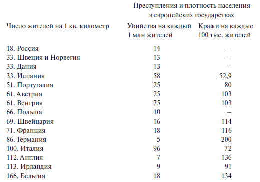 1. Плотность населения. Влияние цивилизации на преступность выступает еще резче при изучении других факторов и особенно плотности населения, ибо история показывает, что в зависимости от нее преступность меняется. Проституция, воровство и телесные повреждения, как справедливо замечают Реклю и Вестермарк, редко наблюдаются у примитивных обществ, как, например, у веддов, которые собираются вместе только в периоды дождей, или у некоторых австралийских племен, живущих отдельными семьями и сходящихся только во время жатвы. Точно так же и у животных редко наблюдается эквивалент преступности, если их не собрано много в одном месте, ибо при этом не могут проявляться с надлежащей силой их животные инстинкты. По мере развития городской жизни появляются те или другие преступления, до этого пребывавшие как бы в недеятельном, скрытом состоянии. Чем менее плотно и густо население какой‑нибудь местности, тем относительно реже наблюдаются среди него преступления, которые растут по мере его развития и достигают бесконечного разнообразия в современном обществе. Достаточно бросить беглый взгляд на преступления против собственности и на убийства, для того чтобы убедиться, что, оставляя в стороне колебания их в зависимости от климата, число краж резко увеличивается, а убийств уменьшается по мере увеличения плотности населения. Из нижеследующей таблицы мы видим, что из семи европейских государств с очень малой плотностью населения наблюдается довольно высокая пропорция убийств в двух (именно в Испании и Венгрии), а из восьми государств с максимальной плотностью его это замечается в одной лишь Италии. В отношении краж наблюдается совершенно обратное явление.