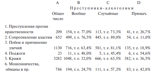 Отсюда мы видим, что наиболее частые преступления – нанесение побоев, причинение увечий, преступления против нравственности и возмущения; за ними по частоте следуют убийства и, наконец, поджоги и кражи. Но последний род преступлений встречается чаще, чем другие, у привычных пьяниц. Менее часты случаи обманов и мошенничеств, ибо для подобной деятельности необходимо, как говорили мне многие мошенники, «иметь здоровую голову, и чтобы она находилась притом на месте». На 3 тысячи осужденных, исследованных Марамбо, пьяниц оказалось 78 %, несколько больше – 79 % – бродяг и профессиональных нищих, убийц было 50 %, осужденных за поджог – 57 %, за преступления против нравственности – 53 %, за воровство и мошенничество – 71 %. В общем преступления против личности составляли 88 %, а против собственности – 77 % всех преступлений. Марро в своих исследованиях приходит к заключению, что среди пьяниц наибольший процент дают разбои, именно 82 %; за ними идут другие преступления в таком порядке: нанесение ран и увечий – 77 %, кражи – 78 %, мошенничества – 66 %, убийства – 62 % и изнасилования – 61 %. Вето из 40 преступников‑алкоголиков нашел: