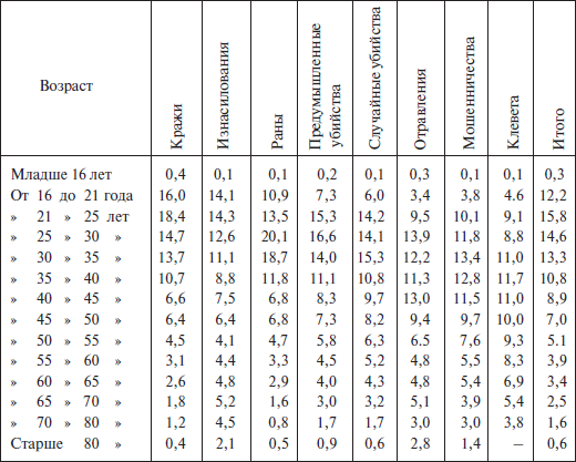 Душевнобольные в 40 и более лет дают заметную пропорцию преступников, именно в два и даже более раз, чем честные люди, среди которых число последних, начиная с этого возраста, заметно падает. По более точным исследованиям оказывается, что возраст, на который падает максимальная преступность, колеблется между 15 и 25 годами. Так, в Англии, где пропорция молодых преступников в возрасте 12–21 года в настоящее время заметно уменьшается, она относится к количеству честных молодых людей как 24:45. В возрасте от 21 года до 30 лет пропорция эта удваивается, и соотношение между обеими категориями молодых людей становится уже равным 50:26, а в возрасте 50 лет и старше она выражается соотношением 23,5:24,8. Леон Леви нашел в Англии следующие цифры для выражения соотношения между преступниками и честными людьми в различные возрасты: