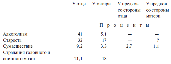 Как и следовало ожидать, склонность к пьянству очень распространена среди преступников. Действительно, Марро нашел этот порок в 74,7 случаях из 100. По его же исследованиям, религиозность развита у преступников почти в той же степени, как у нормального человека; даже у убийц и насильников она еще сильнее; быть может, потому, что преступников последних категорий больше среди деревенских жителей; наоборот, у случайных преступников, за исключением воров, религиозность развита слабо. Склонность к рецидиву и преждевременное развитие порока преобладают среди случайных преступников, имеющих вообще мало признаков вырождения. Что касается наследственности, то она прежде всего зависит от пожилого возраста родителей, от алкоголизма, раздражительности отца, затем, на втором плане, от сумасшествия или преступности родителей.