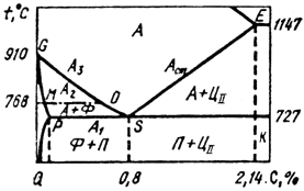 Рис. 8.1. Обозначение критических точек стали Критические точки А1 лежат на линии PSK (727 °C). Критические точки А2 находятся на линии МО (768 °C). Критические точки А3 лежат на линии GS, а критические точки Аcm — на линии SE. Вследствие теплового гистерезиса превращения при нагреве и охлаждении проходят при разных температурах. Поэтому для обозначения критических точек при нагреве и охлаждении используют дополнительные индексы: буквы «с» в случае нагрева и «r» в случае охлаждения. Например, АС1, АС3, Аr1, Аr3. Термическая обработка, заключающаяся в нагреве металла, находящегося в результате каких-либо предшествующих воздействий в неравновесном состоянии, и приводящая его в более равновесное состояние, называется отжигом. Охлаждение после отжига производится вместе с печью. Нагрев при отжиге может производиться ниже и выше температур фазовых превращений в зависимости от целей отжига. Отжиг, при котором нагрев и выдержка металла производится с целью приведения его в однородное (равновесное) состояние за счет уменьшения (устранения) химической неоднородности, снятия внутренних напряжений и рекристаллизации называется отжигом первого рода. Его проведение не связано с прохождением фазовых превращений. Он возможен для любых металлов и сплавов. В зависимости от того, какие отклонения от равновесного состояния устраняются существуют следующие разновидности отжига 1-го рода: гомогенизационный, рекристаллизационный и уменьшающий напряжения отжиг. Гомогенизационный (диффузионный) отжиг — это термическая обработка, при которой главным процессом является устранение последствий дендритной ликвации (химической неоднородности). Рекристаллизационный отжиг — это термическая обработка деформированного металла, при которой главным процессом является рекристаллизация металла. Отжиг, уменьшающий напряжения — это термическая обработка, при которой главным процессом является полная или частичная релаксация остаточных напряжений. Отжиг, при котором нагрев производится выше температур фазовых превращений с последующим медленным охлаждением для получения структурно равновесного состояния, называется отжигом второго рода или перекристаллизацией. Если после нагрева выше температур фазовых превращений охлаждение ведется не в печи, а на воздухе, то такой отжиг называется нормализацией, которая является переходной ступенью от отжига к закалке. Существуют два вида закалки: закалка без полиморфного превращения и закалка с полиморфным превращением. Закалка без полиморфного превращения заключается в нагреве металла или сплава до температур растворения избыточной фазы, выдержке при этой температуре с целью получения однородного пересыщенного твердого раствора, и в фиксации полученного пересыщенного твердого раствора за счет быстрого охлаждения в сильном охладителе (вода, масло и др.). В результате этого сплав имеет структурно неустойчивое состояние. Этот вид закалки характерен для сплавов алюминия с медью — дуралюминов. Термическая обработка, заключающаяся в нагреве металла выше температур фазовых превращений с последующим быстрым охлаждением для получения структурно неравновесного состояния, называется закалкой с полиморфным превращением. Этот вид закалки характерен для сплавов железа с углеродом (стали). После закалки в стали об