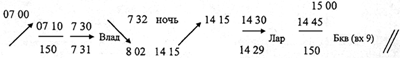 получить от экипажа ВС фактическое время взлета, нанести в пятой колонке условный знак и записать время взлета. Например: взлет ВС в 14 ч 15 мин: