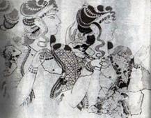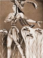 Придворные Критские дамы, разряженные и оживлённые, глядят на какое-то состязание или церемонию... Возможно, это не просто дамы, а жрицы. У них такое же одеяние как у богинь или жриц со змеями. Прекрасен смуглый юноша, несущий ритон, на фрагменте другой фрески. Прекрасен юноша с осиной талией, в диадеме, такой гордый и властный, что в исследованиях о критском искусстве его называют то "принцем", то "царём-жрецом".