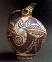 Ваза с осьминогом Узенькие полоски бегущей спирали на сосудах раннего минойского периода расположены по тулову не только горизонтально, но и пересекают его наискось, ложатся на тёмную поверхность подвижными светлыми штрихами. При этом критский живописец всегда стремился рисунком подчеркнуть форму сосуда. Около 1470 до н. э. некоторые центры эгейской культуры, особенно на Крите, в значительной степени пострадали от извержения вулкана Санторин на острове Тира (Фера), находившийся здесь дворец был погребен под пеплом. Это во многом ускорило упадок минойской культуры, на Крите после этого появилось ахейское (микенское) население, принесшее новую культуру. Кносс, единственный оставшийся дворец на острове, около 1400 до н. э. подвергся разрушению. В конце XIII в. до н. э. для эгейской культуры наступил глубокий внутренний кризис, нашествие дорийцев и «народов моря» привело эгейскую культуру к гибели. Микены