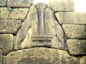 Золотая маска микенского царя Микенская культура формировалась под сильным влиянием критской, приобретая, однако, черты, отличающие её памятники от памятников самого Крита. Росписи в соседнем с Микенами Тиринфе более схематичны, менее живописны, чем в Кносе, хоть некоторые сцены и не лишены динамизма. Критская волшебная лёгкость исчезла вместе с несравненным критским изяществом и изобразительным мастерством. Новые черты микенского художественного гения особенно явственны в зодчестве и монументальной скульптуре. В отличие от от критских микенские дворцовые постройки окружены крепостными стенами. Это уже не беспечный мир, согретый иллюзией безопасности: Пелопоннес уязвим и с моря и с суши. Циклопическая кладка, названная так за огромные размеры камней, поднять которые под силу лишь сказочным великанам, придаёт постройкам несколько примитивный, но внушительный вид. Она характерна и для Микен, и для Тиринфа. Мощные каменные стены не дают растекаться отдельным ячейкам здания, как это происходит в Кносском дворце, они собирают здание воедино, превращая его в военную крепость, где доминирует центральное помещение - мегарон - с четырьмя внутренними колоннами, поддерживающими крышу и обрамляющими очаг. Мегароны царей в Микенах и Тиринфе, прямолинейные в плане дворцовые изолированные постройки, состоящие из открытых сеней с двумя столбами, переднего помещения и зала с очагом посередине, считаются прототипами первых греческих храмов.