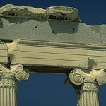 Ионический ордер развился в островной и малоазийской Греции. Ионические колонны, более тонкие и вытянутые, опираются на базу и завершаются капителью, высеченной из прямоугольного блока. Капитель образована двумя завитками (волютами). В большинстве дошедших до нас храмов применены дорический и ионический ордера.