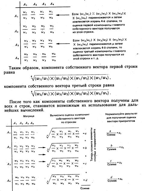 На этом этапе в нашем примере семья построила иерархию, составила матрицы и выразила субъективные парные суждения. Как они помогут определить тот дом, который следует купить? В этом разделе описывается, каким образом сочетаются иерархическая декомпозиция и шкала относительной важности для получения осмысленных подходов к многокритериальным проблемам планирования. А. СИНТЕЗ: ЛОКАЛЬНЫЕ ПРИОРИТЕТЫ Из группы матриц парных сравнений мы формируем набор локальных приоритетов, которые выражают относительное влияние множества элементов на элемент примыкающего сверху уровня. Находим относительную силу, величину, ценность, желательность или вероятность каждого отдельного объекта через «решение» матриц, каждая из которых обладает обратносимметричными свойствами. Для этого нужно вычислить множество собственных векторов для каждой матрицы, а затем нормализовать результат к единице, получая тем самым вектор приоритетов. Вычисление собственных векторов — не очень сложная задача, однако может потребовать довольно много времени. К счастью, имеются несложные пути получения хорошего приближения к приоритетам. Одним из наилучших путей является геометрическое среднее. Это можно сделать, перемножая элементы в каждой строке и извлекая корни п -й степени, где п — число элементов. Полученный таким образом столбец чисел нормализуется делением каждого числа на сумму всех чисел. Иной способ заключается в нормализации элементов каждого столбца матрицы и затем в усреднении каждой строки. Таким образом, мы можем определить не только порядок приоритетов каждого отдельного элемента, но и величину его приоритета. При использовании любого метода аппроксимации существует опасность изменения порядка ранжирования и поэтому получения нежелательных результатов. Подход, основанный на собственном векторе, использует информацию, которая содержится в любой, даже несогласованной матрице, и позволяет получать приоритеты, основанные на имеющейся информации, не производя арифметических преобразований данных. Для индивидуума или группы лиц идея заключается в том, чтобы решить, хотят они или нет изменить суждения.
